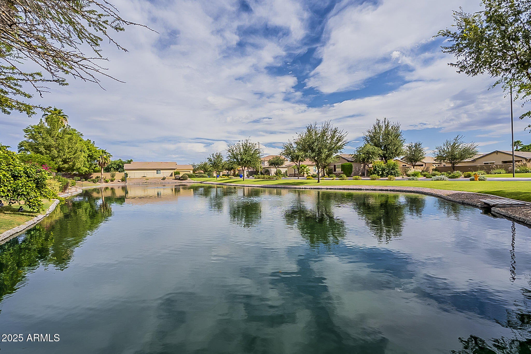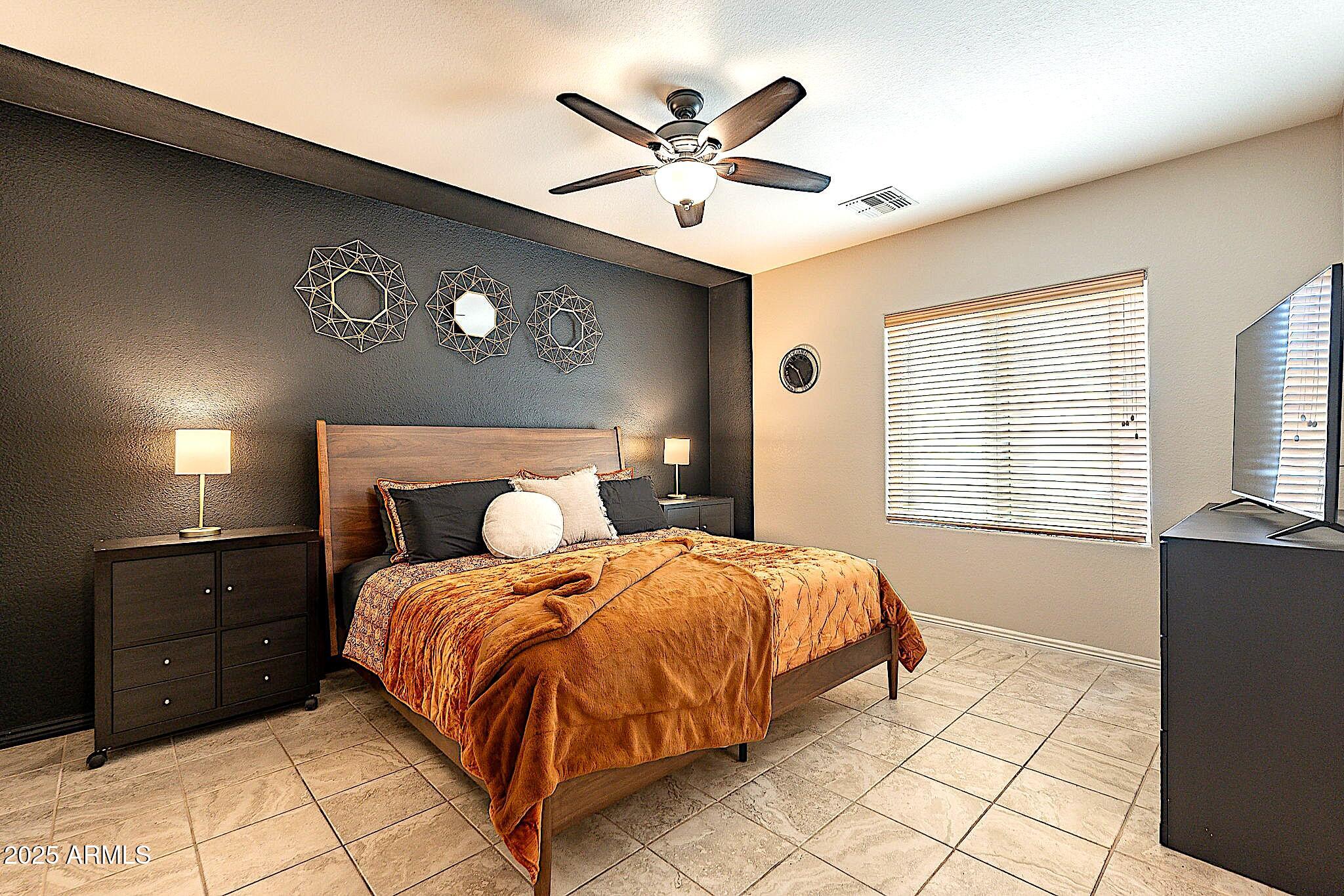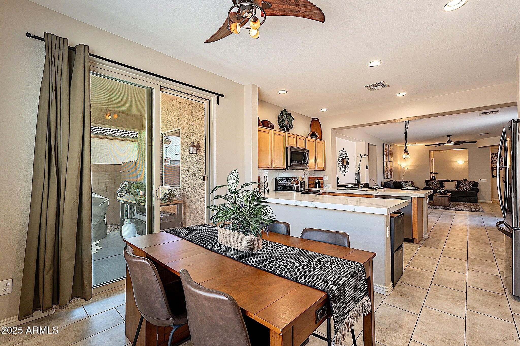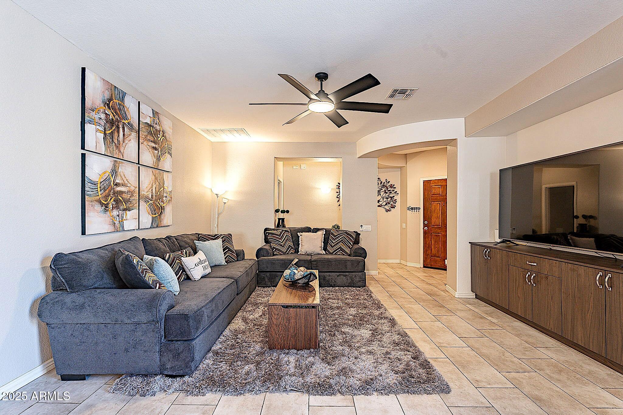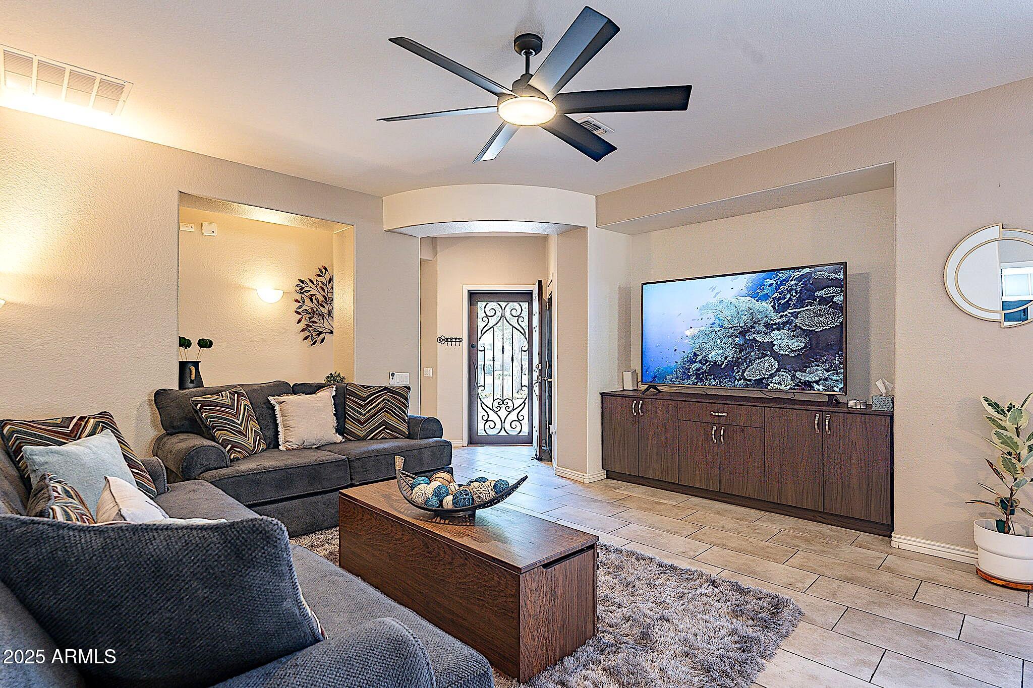 This beautifully maintained single-level home offers 3 bedrooms, 2 baths, and an open-concept greatroom and dining area with sliders leading outside. The kitchen comes complete with black stainless steel appliances, sleek quartz countertops, ample cabinets, and 2 large islands with breakfast bar seating. The private primary suite has a large bedroom, natural lighting, and bathroom with dual sinks, soaking tub/shower combo, and custom-designed walk-in closet. Tile flooring throughout, new AC unit (2023), new water heater (2025), water softener, and RO system. Parking for up to 5 vehicles and epoxy floors and ceiling storage racks in the garage. Nestled in a highly desired gated lake community with lush greenbelts, walking paths, playgrounds, covered ramadas, BBQ grills, & basketball court.