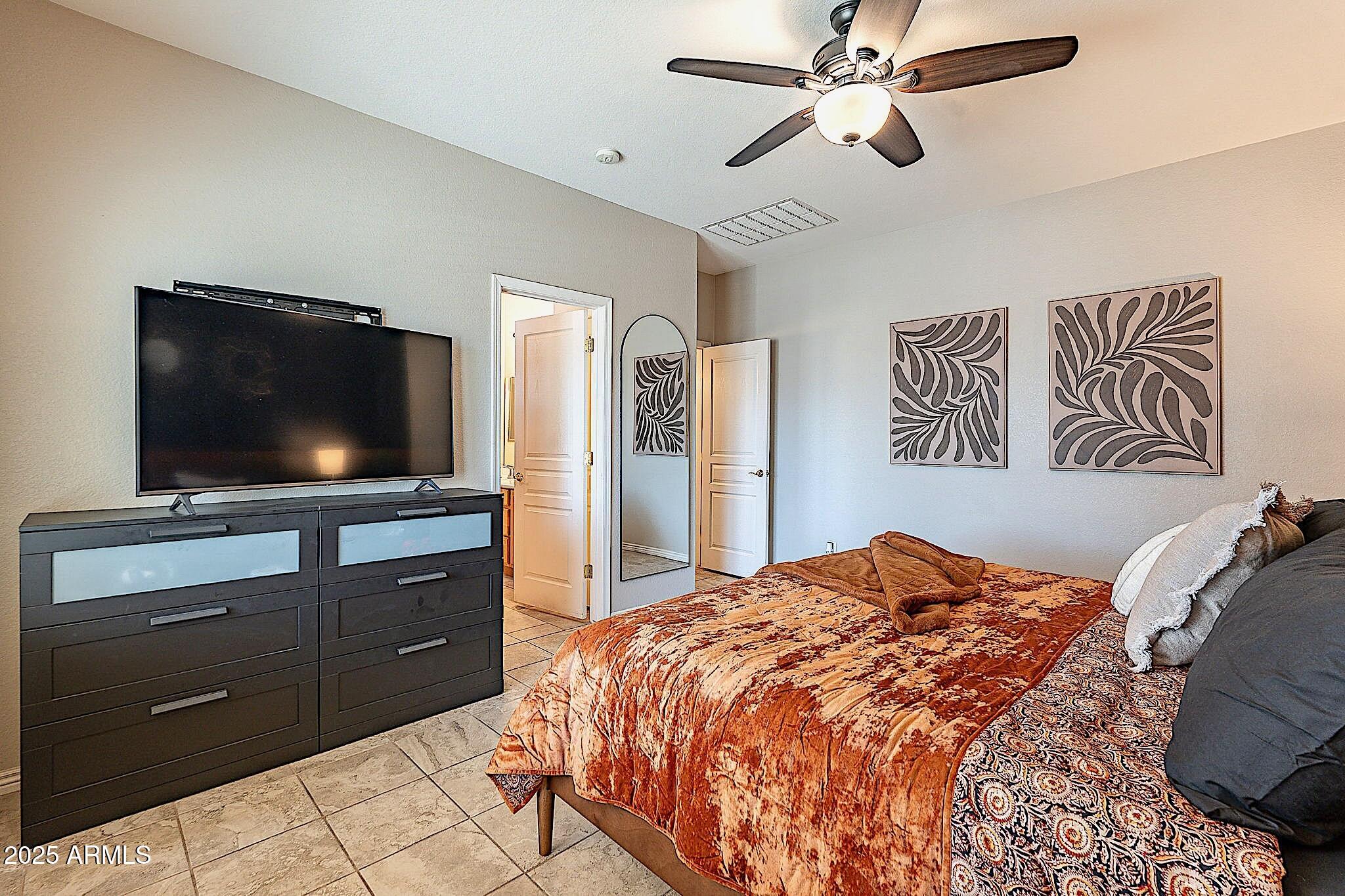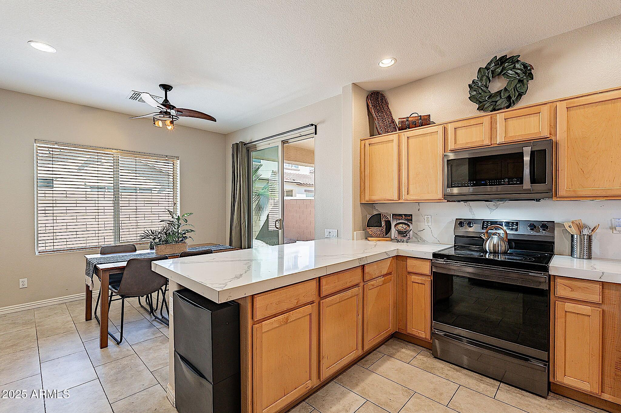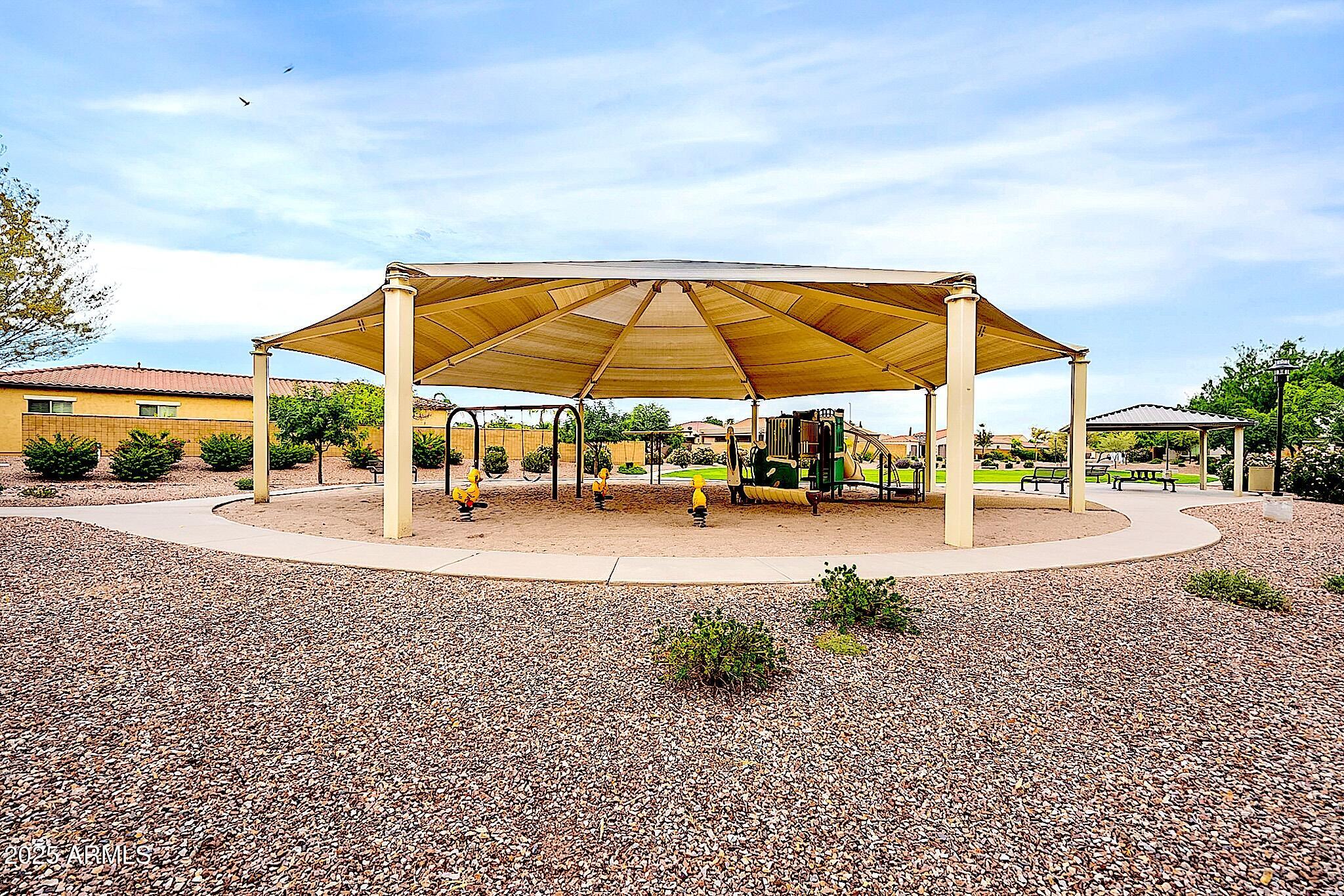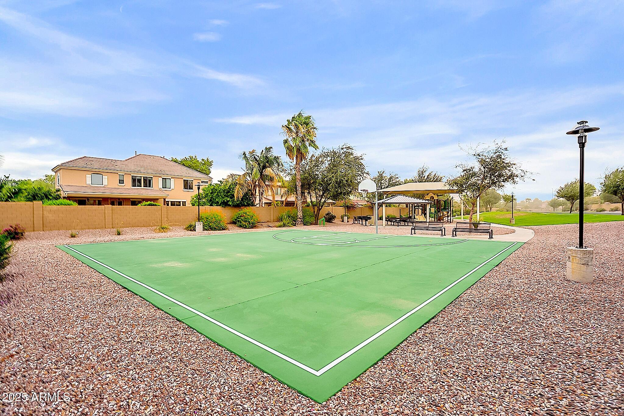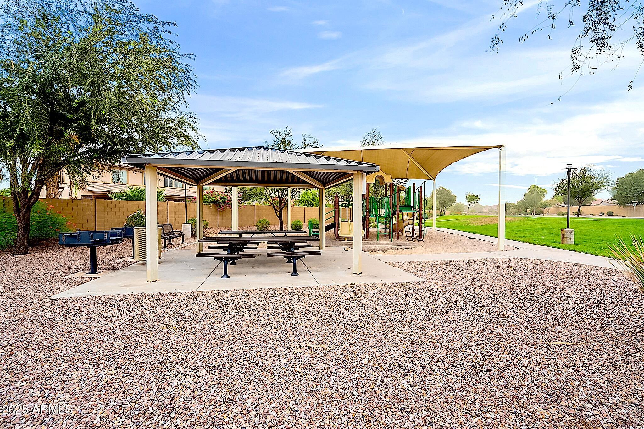 This beautifully maintained single-level home offers 3 bedrooms, 2 baths, and an open-concept greatroom and dining area with sliders leading outside. The kitchen comes complete with black stainless steel appliances, sleek quartz countertops, ample cabinets, and 2 large islands with breakfast bar seating. The private primary suite has a large bedroom, natural lighting, and bathroom with dual sinks, soaking tub/shower combo, and custom-designed walk-in closet. Tile flooring throughout, new AC unit (2023), new water heater (2025), water softener, and RO system. Parking for up to 5 vehicles and epoxy floors and ceiling storage racks in the garage. Nestled in a highly desired gated lake community with lush greenbelts, walking paths, playgrounds, covered ramadas, BBQ grills, & basketball court.