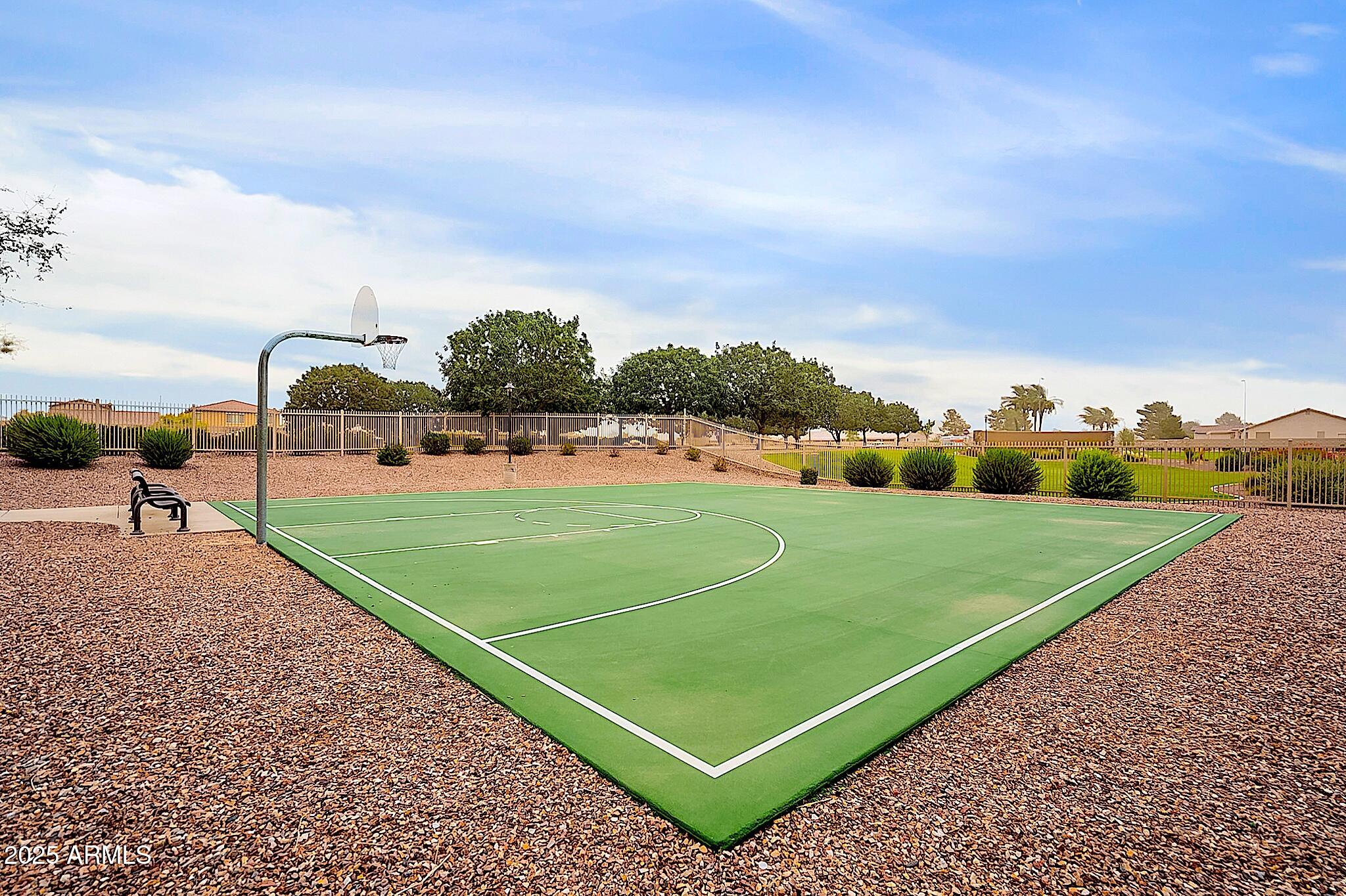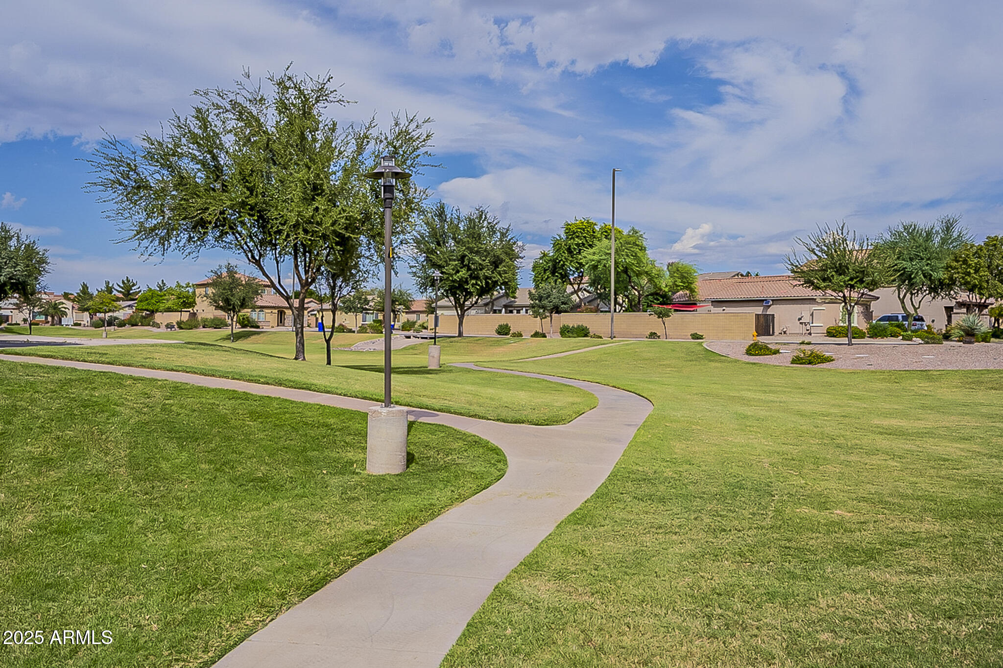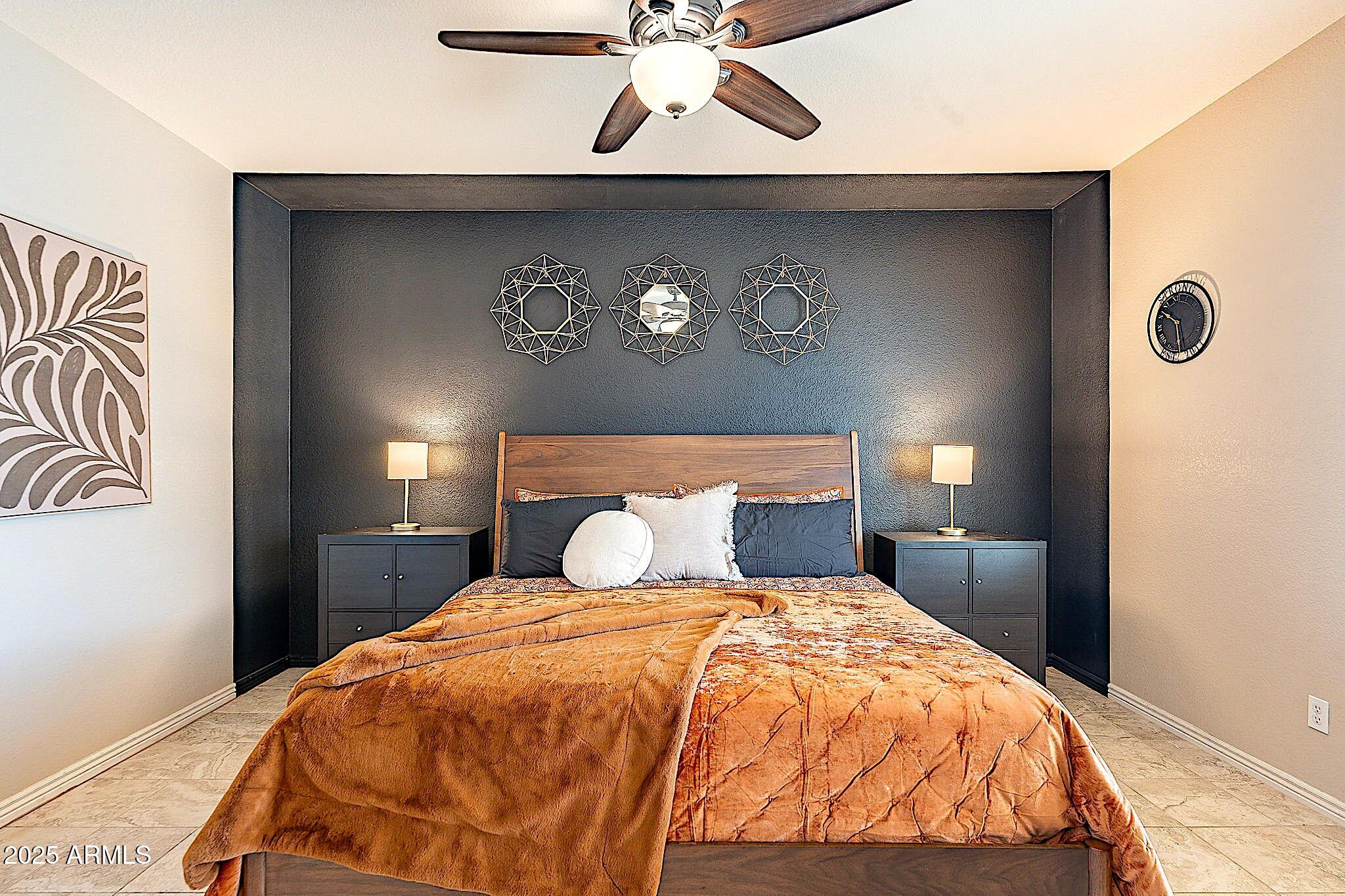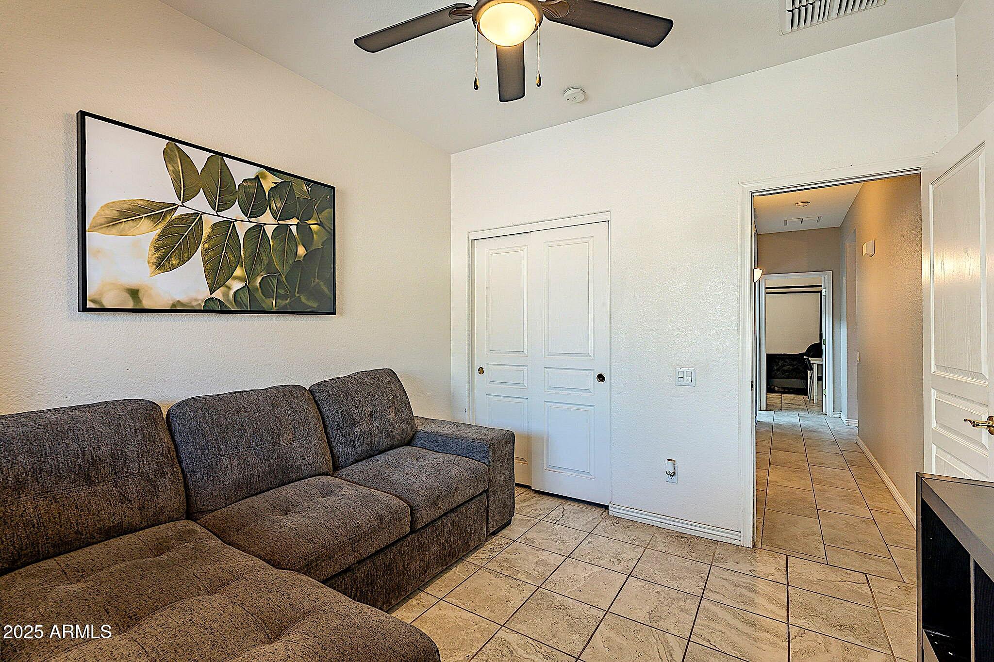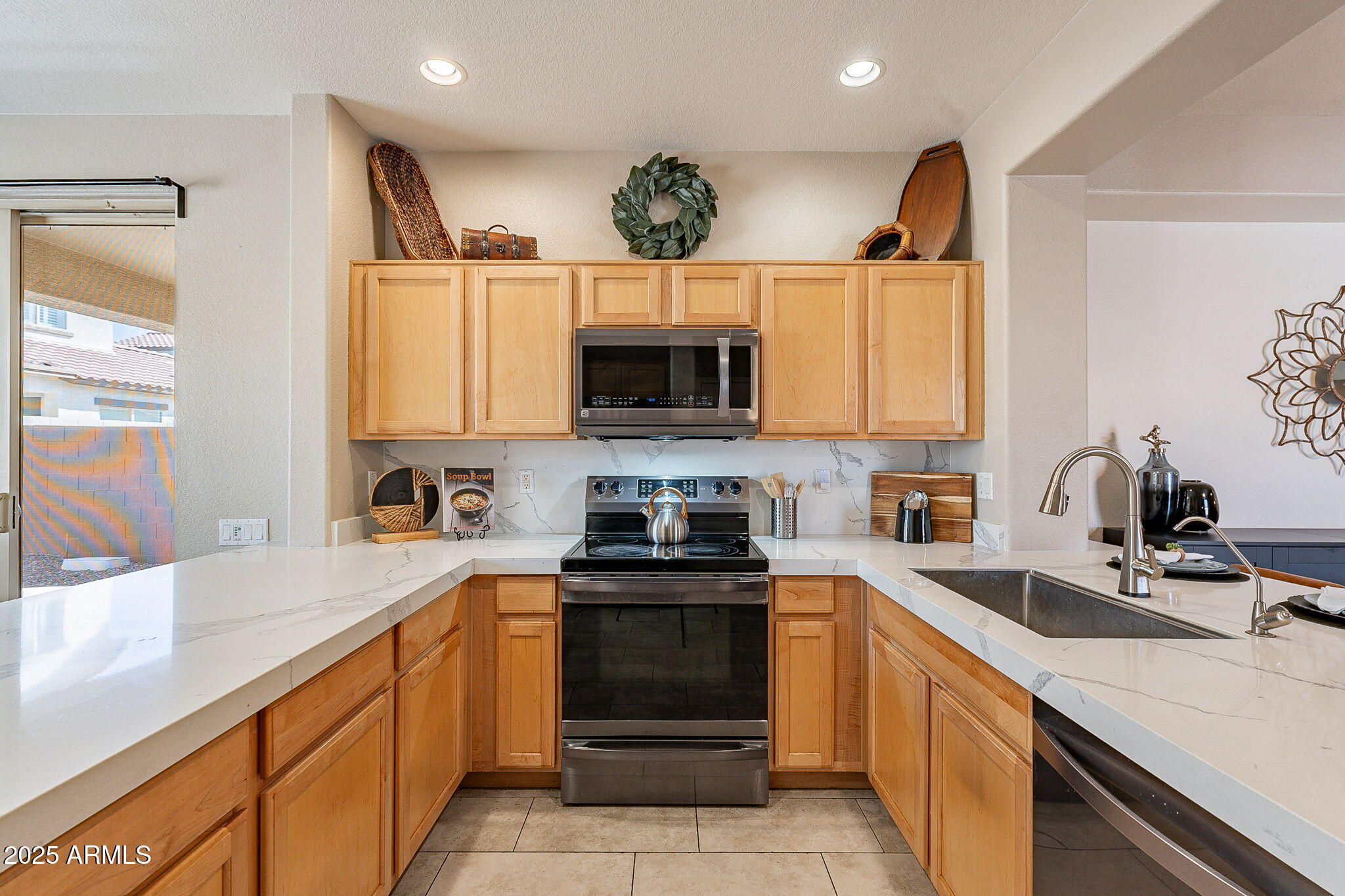 This beautifully maintained single-level home offers 3 bedrooms, 2 baths, and an open-concept greatroom and dining area with sliders leading outside. The kitchen comes complete with black stainless steel appliances, sleek quartz countertops, ample cabinets, and 2 large islands with breakfast bar seating. The private primary suite has a large bedroom, natural lighting, and bathroom with dual sinks, soaking tub/shower combo, and custom-designed walk-in closet. Tile flooring throughout, new AC unit (2023), new water heater (2025), water softener, and RO system. Parking for up to 5 vehicles and epoxy floors and ceiling storage racks in the garage. Nestled in a highly desired gated lake community with lush greenbelts, walking paths, playgrounds, covered ramadas, BBQ grills, & basketball court.
